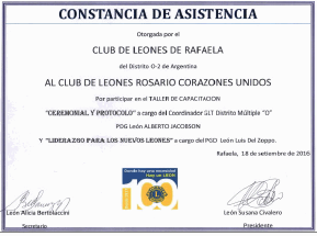 En ciudad de San Lorenzo se concurrio a la reunion conjunta de zonas 16 y 17. Participamos leones Presidente Juan Carlos Marazzi, Secretario Carlos R. Mazzetti, Tesorero Alberto Jacobson , Director Comité afiliación Jorge Tramallino, leones Cristina Ruiz, Mónica Bruno, Lidia Rosemberg y Beatriz Donadille. Hubo capacitación para autoridades de clubes y se participo de la charla del Vicegobernador Sergio Carreras.